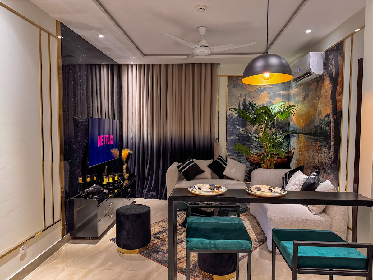 Our 1 BHK Orbit Penthouse in DHA Phase 5 is where urban chic meets celestial cool. Think: a glowing moon wall for those late-night selfies and a bold dollar-stacked art piece that screams "main character energy" Wake up to park views from your private balcony swing, binge your faves on the 50" 4K Smart TV, or cook up something aesthetic in the fully loaded designer kitchen. The interiors? Abstract, stylish, and made for the feed. Plus, you're right next to Lahore's hottest dining spots.