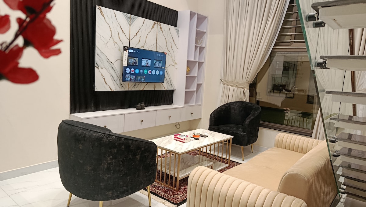 Step into a modern retreat designed for comfort and mood. The apartment features a stunning starlight ceiling that creates a calm, romantic atmosphere. Enjoy cinematic nights on a 65-inch Haier Android TV with high-speed Wi-Fi for seamless streaming. The equipped kitchen offers everyday convenience, while the soft mattress and spacious sofa ensure complete relaxation. Finished with modern interiors and artistic aesthetics, this space is perfect for cozy nights and stylish living.