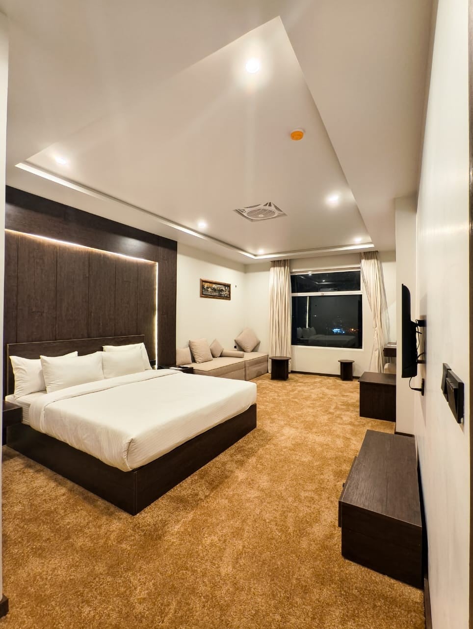 Stay at the Junior Suite at C-Suites, where style meets comfort in the heart of Bahria Town, Lahore. This 30 sqm suite offers 1 elegantly furnished bedroom, 1 modern bathroom, and a relaxing lounge. Enjoy premium bedding, daily housekeeping, high-speed Wi-Fi, and our on-site restaurant serving authentic Pakistani cuisine. Perfect for business and leisure stays.
