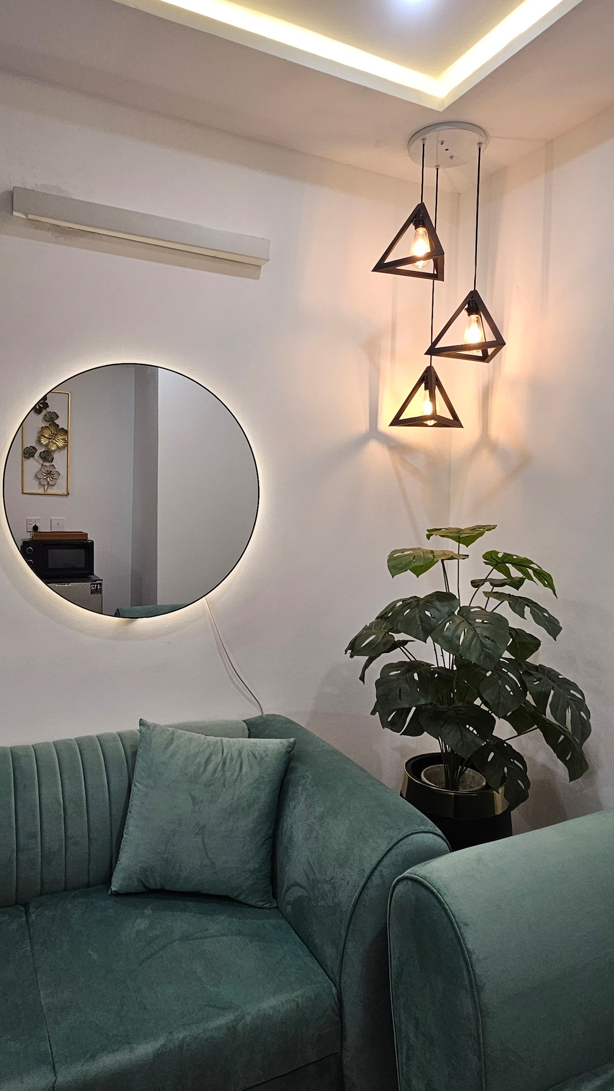 Our 1 BHK Orbit Penthouse in DHA Phase 5 is where urban chic meets celestial cool. Think: a glowing moon wall for those late-night selfies and a bold dollar-stacked art piece that screams "main character energy" Wake up to park views from your private balcony swing, binge your faves on the 50" 4K Smart TV, or cook up something aesthetic in the fully loaded designer kitchen. The interiors? Abstract, stylish, and made for the feed. Plus, you're right next to Lahore's hottest dining spots.