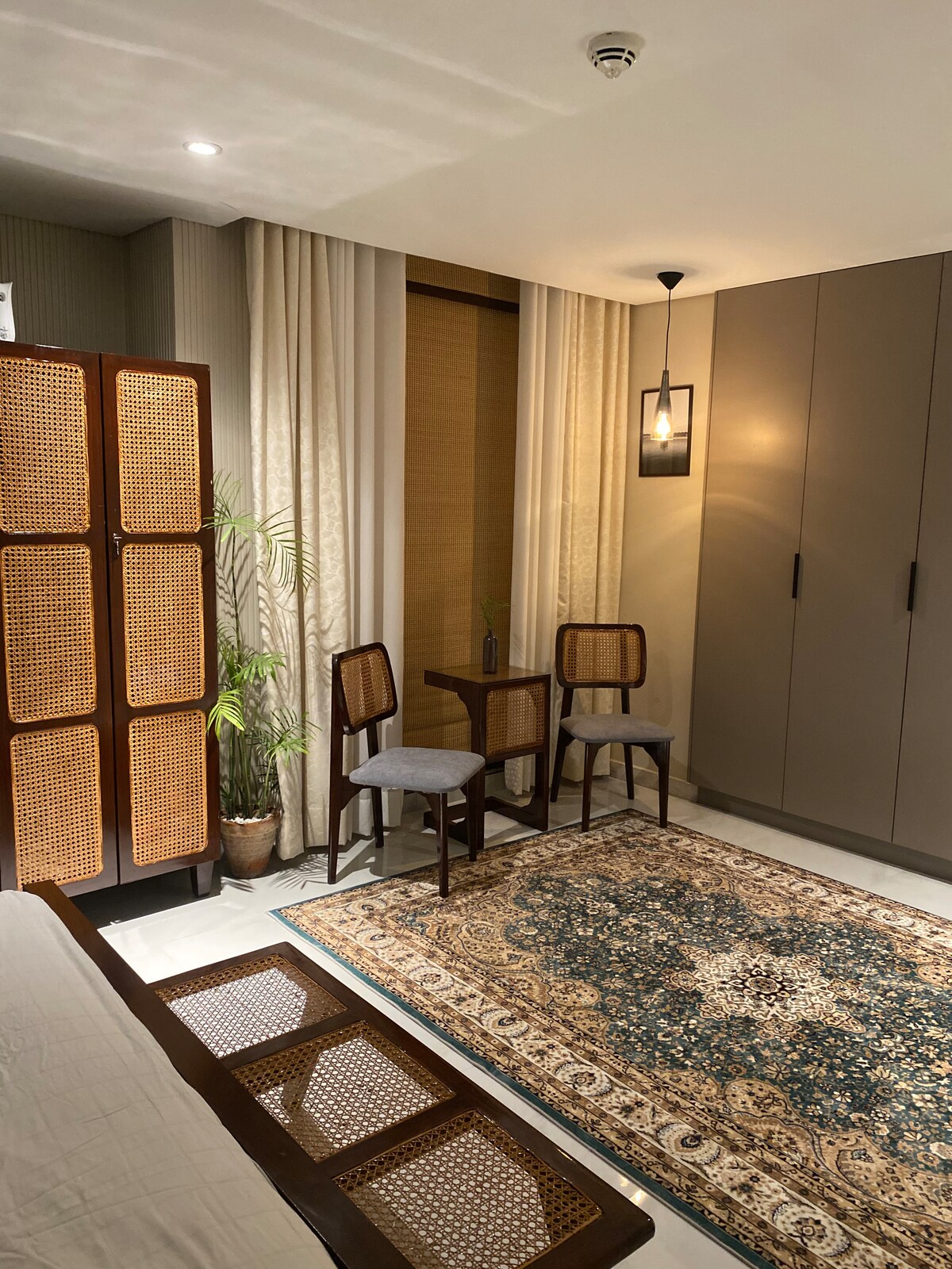 Thoughtfully styled with authentic cane heritage furniture, this apartment carries the quiet poetry of old Lahore warm textures, soft light, and a nostalgia you don’t have to explain. It’s not just a stay, it’s a feeling. Located right on MM Alam Road, Gulberg; you’re surrounded by Lahore’s most vibrant cafés, restaurants, and boutiques—yet inside, it feels calm, grounded, and gently removed from the noise. A blend of heritage charm and urban convenience.