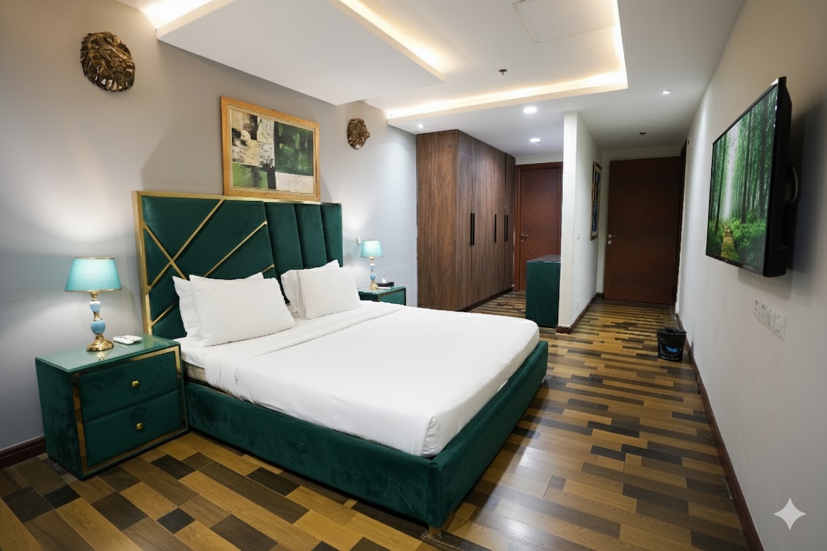 ★ Located in PENTASQUARE DHA PHASE 5 ★ 1 Bedroom Luxury Apartment ★ Luxury Living Room with Sofa Bed ★ SAMSUNG QLED TV ★ 1 Bedroom with King Bed ★ 1.5 Bathrooms with Modern Fittings ★ 5 mins drive to Dolmen Mall ★ Garden facing apartment ★ Check-in with Smart Lock ★ Grocery & Cafes within the building ★ 24x7 Heating & Cooling (Central) ★ Fully Equipped Kitchen. ★ Free Mattresses ★ Free Parking ★ 5G Internet ★ 24x7 Power Backup ★ Clean Linens - Free Toiletries ★ 24x7 Security & Reception