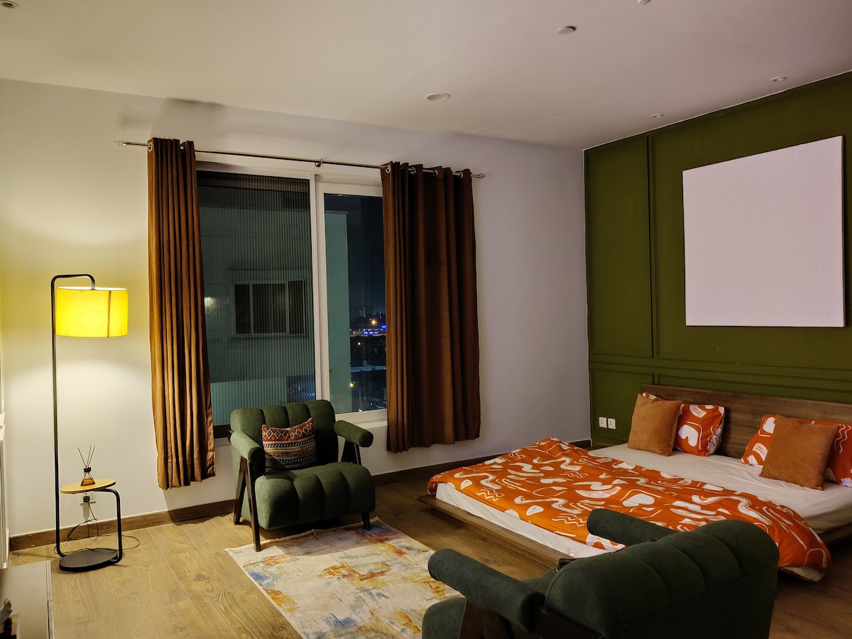 Our 1 BR condo in DHA Phase 5 is where urban chic meets celestial cool. Think: a glowing moon wall for those late-night selfies and a bold dollar-stacked art piece that screams "main character energy" Wake up to park views from your private balcony swing, binge your faves on the 50" 4K Smart TV, or cook up something aesthetic in the fully loaded designer kitchen. The interiors? Abstract, stylish, and made for the feed. Plus, you're right next to Lahore's hottest dining spots.