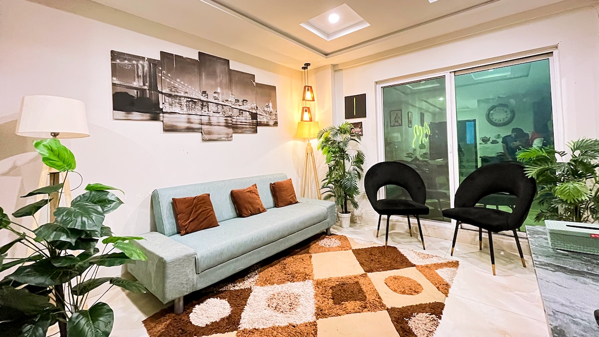 Welcome to my peaceful elegant and minimalistic decor 2 bedroom luxury apartment. it is centrally located in Lahore with all the necessary amenities inside it. ---- Free high speed Wifi 24/7 electricity backup on automatic generator Instant hot water Elegantly decorated lounge Both bedrooms have a terrace with a lovely view 3 Inverters ideal for summer and winter 55-inch Samsung Smart TV Voice-activated includes (Prime video, Youtube etc.) Microwave Refrigerator Cloth Iron stand