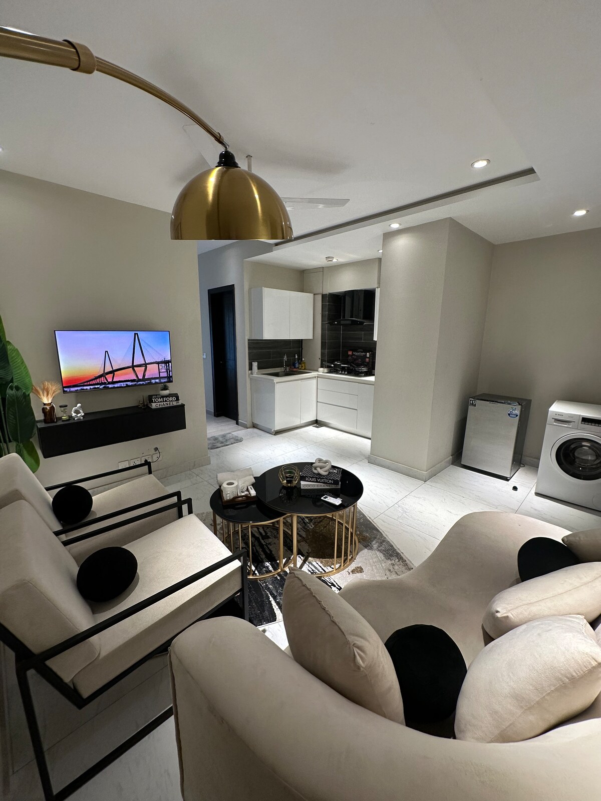 Experience designer living at Luniq, just steps from MM Alam Road the heart of Lahore’s cafes, boutiques, and nightlife. • 🛋️ Aesthetic lounge with cozy rugs, hanging lamp & full-length curtains • 🛏️ Plush king-size bed with premium bedding & city views • 55” Android Smart TV with Netflix & YouTube Premium • 🍳 Fully equipped modern kitchen with essentials • ⚡ Fast Wi-Fi for work or streaming • 🔑 Seamless self check-in for complete privacy • 🌆 Prime Gulberg location