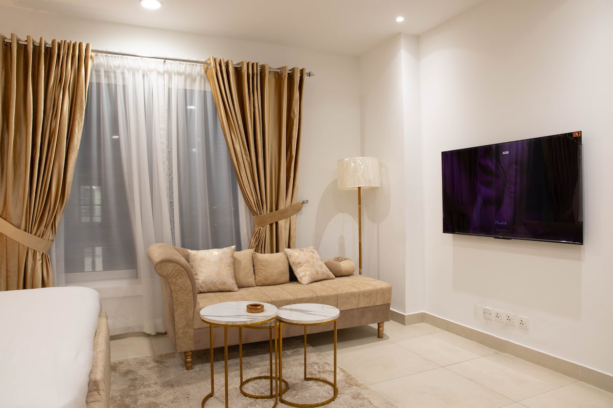 Sapphire Studio by Avion Homes in Penta Square DHA Phase 5 – Perfect for Families & Business Travelers This bright, modern Luxury Sapphire Studio comes with a comfortable queen bed, well-equipped kitchenette, everything you need for a relaxing stay. Centrally located in DHA Phase 5, near International AirPort. 55’’ 4K LED (Netflix) Wi-Fi 24 Hour Reception Central Heating only Tea/Coffee Bar Access to Park - Jogging Track Guests must provide a photo of govt issued ID before checkin