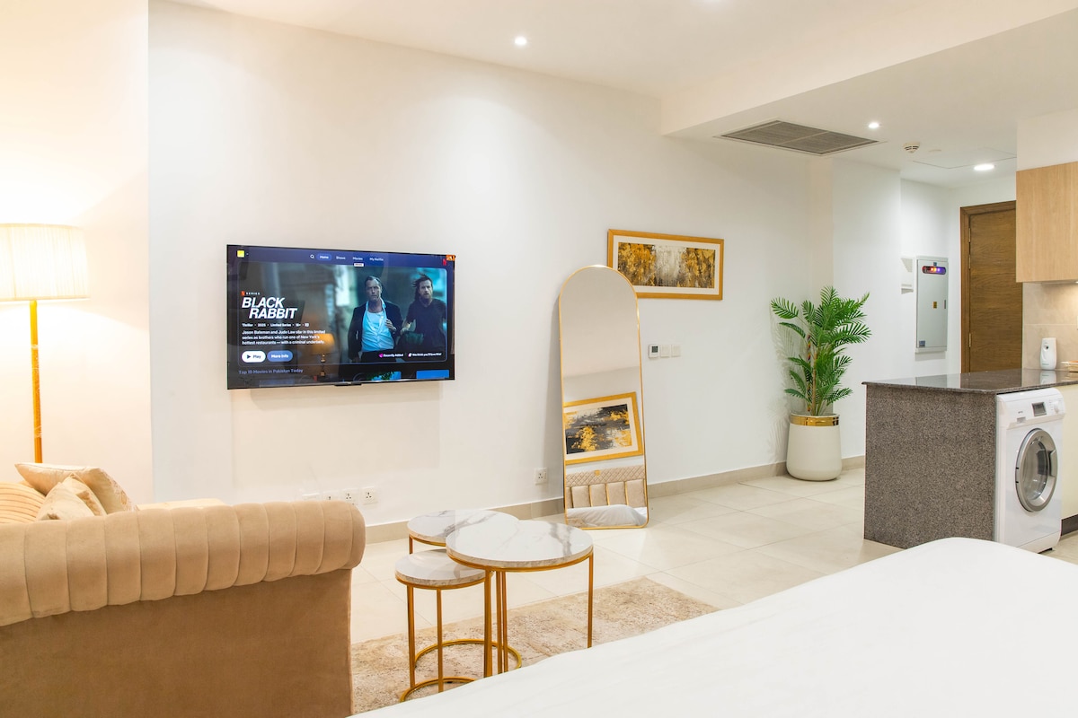 Sunlit Studio in PentaSquare DHA Phase 5 – Perfect for Families & Business Travelers This bright, modern sunlit studio with a garden view features a comfortable queen bed, well-equipped kitchenette, everything you need for a relaxing stay. Centrally located in DHA, walking distance from Cinnabon, Baskin Robbins, KFC, Imtiaz store & near Gulberg/AirPort. Self Check-in 55’’ 4K LED (Netflix) Wi-Fi 24 Hour Reception Central Cooling Room Service Tea/Coffee Bar Access to Park - Jogging Track