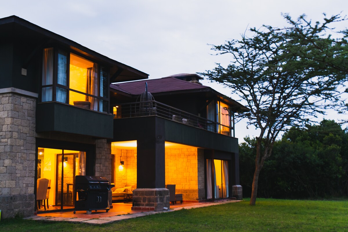 Kilima House, perched on a hill with views of three mountain ranges, blends minimalist design with Kenyan craftsmanship. Each room offers vistas of lush gardens or Mt. Kenya. Guests enjoy a private infinity pool, cinema, shared wood-fired sauna, and a sundowner treehouse. The fully serviced rental includes a chef to prepare breakfast and dinner (half-board) ensuring a tranquil and exclusive retreat. The house has three ensuite bedrooms and two garden bungalows with additional three bedrooms.