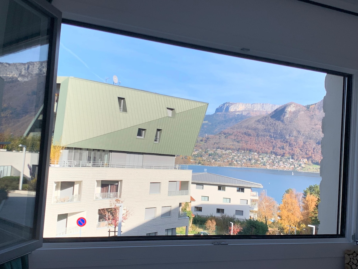 Push the door open: “Wow, what a view!”. The apartment is atypical and offers an exceptional view of lake Annecy. Cross the road and you will find your feet in the water at the edge of the building's private beach. Can't get enough of the view! The accommodation is a 10-minute drive from the center of Annecy. Please note: - The road can be noisy when there is traffic. One of the bedroom is on the road side. We advise to book the apartment for 2 adults and 2 kids.