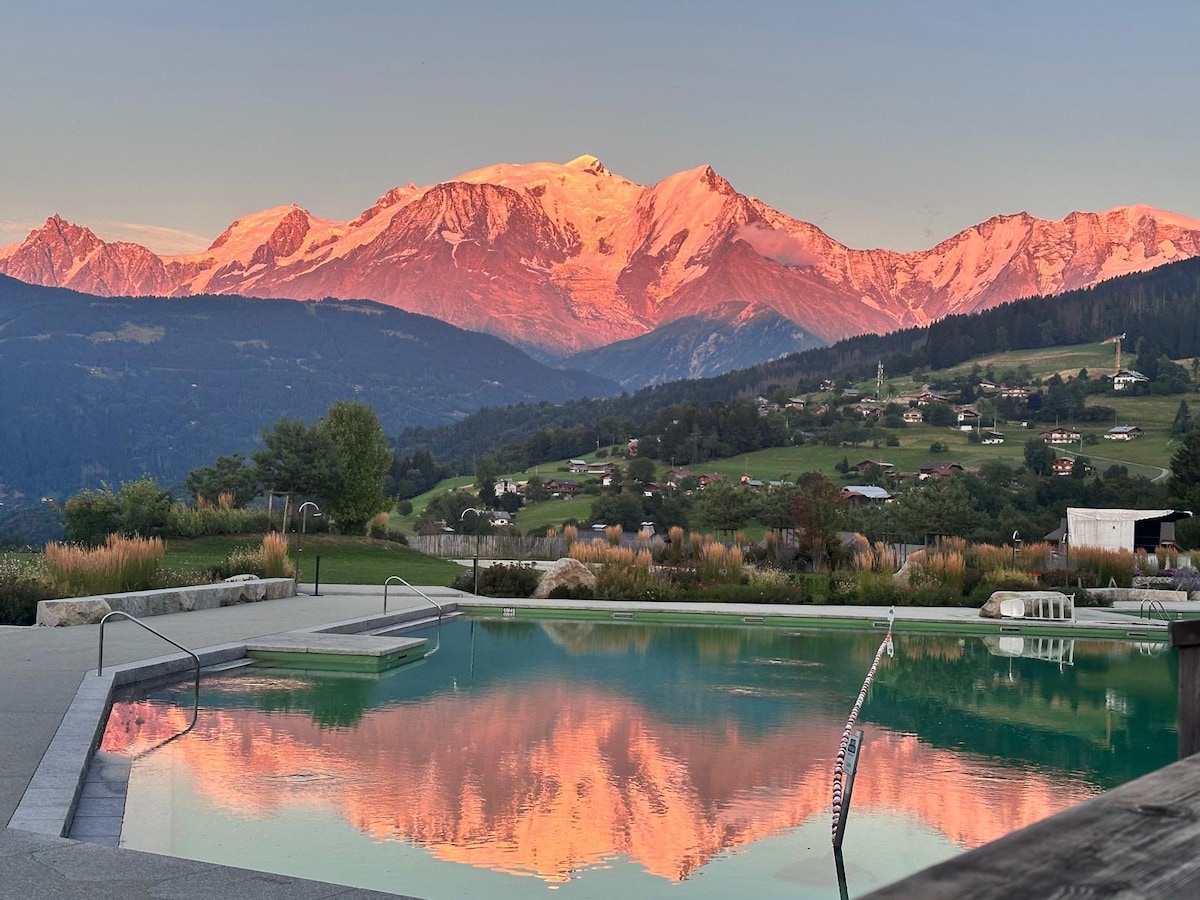 Le Chalet MALOUHÉ (neuf) de 210 m2, offre une vue panoramique époustouflante sur l'église du village, le Mont-Blanc, la chaîne des Alpes et la vallée. Situé sur les hauteurs du centre de Combloux, le calme règne. Authentique et contemporain, il est équipé de prestations de qualité et de haut de gamme : accueil personnalisé avec un service de conciergerie. Vous êtes à deux pas des commerçants, des départs des randonnées, et pour l'hiver à 50 mètres d'un arrêt de la navette SkiBus gratuite.