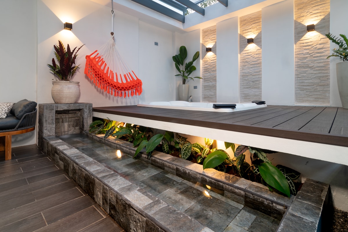 Our beautiful cabin is located above a small waterfall, surrounded by trees 🌳 and green gardens 🌿 that create a unique and relaxing experience 😌. 🏡 Amenities: • 1 bedroom with A/C ❄️ and private bathroom 🚿 • Spacious outdoor balcony 🌅 with private bathtub 🛁 • Fully equipped kitchen 🍳 • Smart TV 📺 • High-speed Wi-Fi 📶 💆♀️ You’ll also have access to our Spa Area, small gym 💪, BBQ area 🔥, and the entire property surrounded by nature 🚶♂️🍃 —perfect for relaxing walks