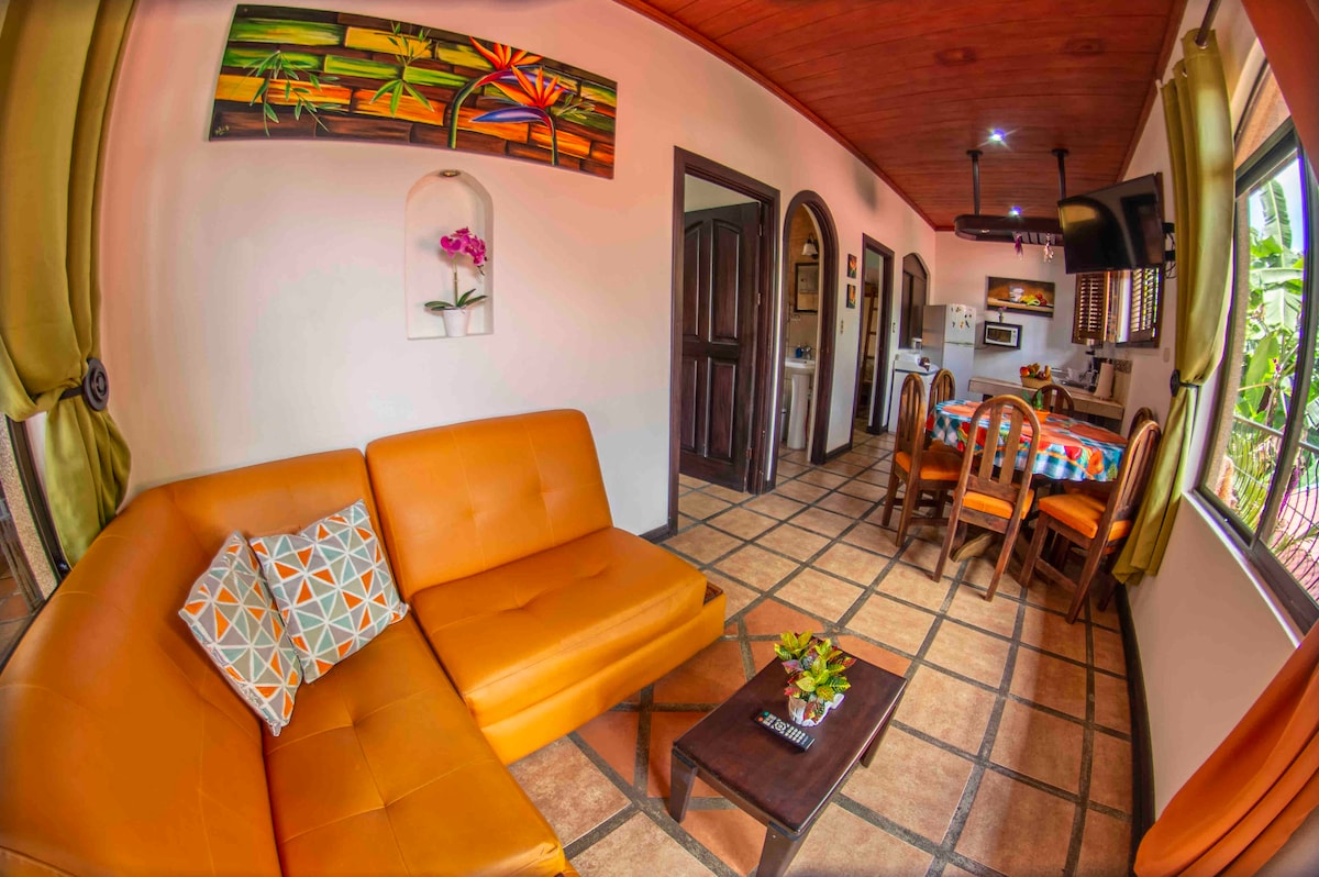 Relájate en este espacio tan tranquilo y elegante. A 1 km del centro de Fortuna y a 300 m del Salto. Camino a la catarata de la Fortuna. El loft cuenta con terraza deck, piscina, jardín, un cuarto con cama king, baño, cocina totalmente equipada, centro de lavado, parqueo privado, AC, acabados de lujo, vistas extraordinarias hacia el volcán y en contacto con la montaña, ideal para citas románticas, relajarse y pasarla bien lejos del bullicio de la ciudad, pero a solo 2 min del centro de Fortuna.