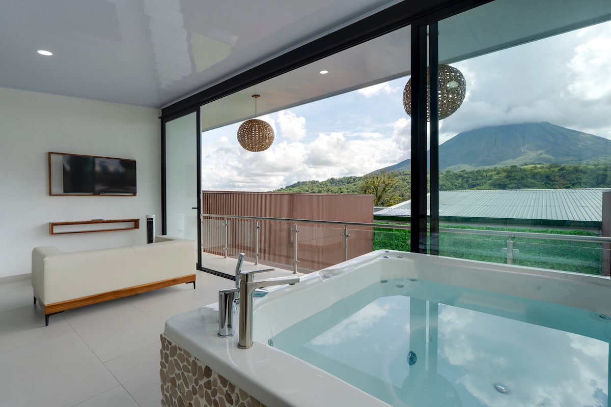 This new romantic, luxurious and wellness villa offer you the best sensorial experience. With an amazing jacuzzi immersed in a tropical garden. This Villa is located just 3 blocks from the center of Fortuna and at the same time, away from the noisy streets. 100% equipped with: cooking area, 300Mbps fiber internet, big king bed, air conditioning, 55'' smart tv, unique bathroom surrounded by exuberant nature. A lower terrace and an upper terrace with the best panoramic view of the arenal volcano.