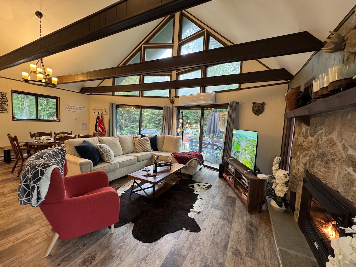 A stunning chalet ideally situated in the Pocono mountains. Your destination for a weekend escape or a longer stay all year round! Outside one can enjoy a natural setting in a beautiful 1-acre private wooded property, hot tub, two fire pits, a deck for morning coffee, or a delicious BBQ. Our home offers a tranquil interior atmosphere and home is conveniently located near all Pocono Mountains' seasonal activities. Whether you want to unwind or recharge, our home provides the perfect retreat.