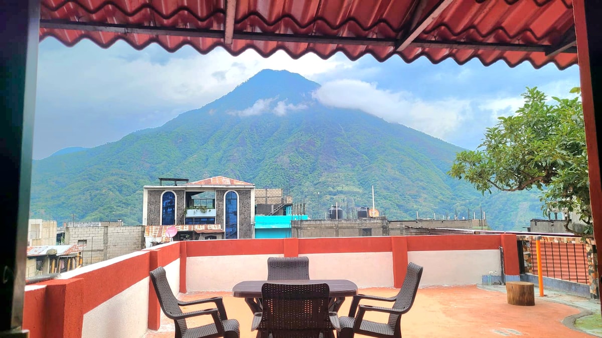 Guests will enjoy access to the second floor of the house centrally located place only steps away from the market. Enjoy breathtaking views of volcan San Pedro. 2 queen size beds in one big room and 1 bed in a smaller room that can accommodate 5 people with a solar powered shower and washroom. Smart TV available. No parking on site. If you have a vehicle, nearby parking can be arranged. NO PETS allowed. There is internet available but not stable as it is from the local town.