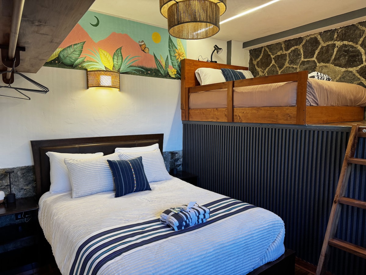 Hospédate en una amplia habitación con dos camas matrimoniales, ideal para 2 a 4 personas. Incluye desayuno gratuito en el rooftop con espectaculares vistas al lago y volcanes. Disfruta de atención 24 hrs, recepción dedicada y espacios modernos diseñados para tu comodidad. La habitación cuenta con cafetera con café y té, agua de cortesía, secadora y baño privado. Perfecta para familias o grupos que buscan confort y una experiencia única en Panajachel.