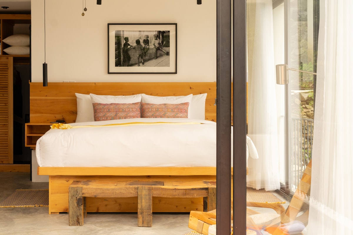 Relax in our cozy, high-end ensuite featuring a handcrafted King bed. Step out to the stunning views of Lake Atitlán, lush gardens, and majestic mountains, creating a peaceful haven for ultimate relaxation. Savor your meals in a shared elevated outdoor kitchen directly in front of the room, offering a perfect setting to enjoy the spectacular scenery. With private access to a tranquil pool, spa and a scenic garden pathway to the lake’s dock, your stay will be truly memorable.