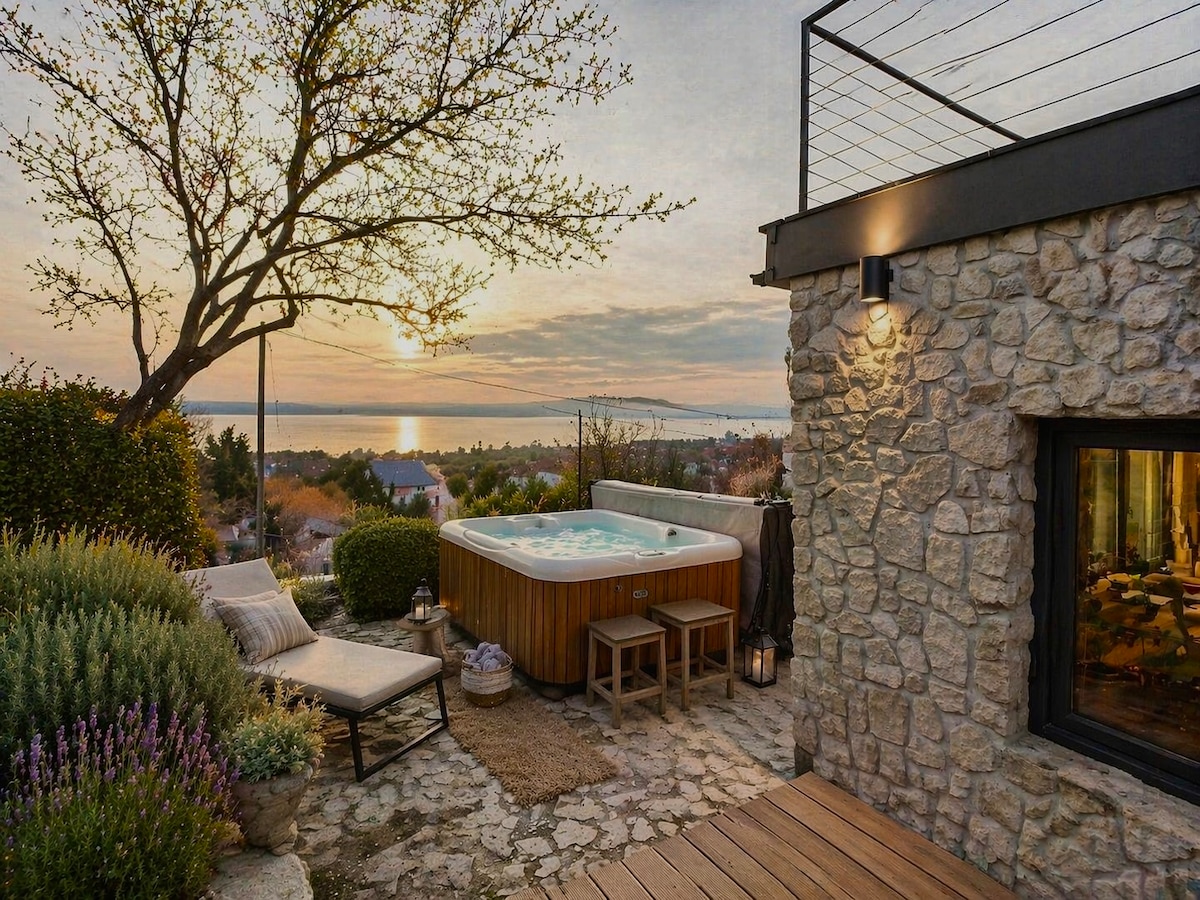A truly special place just an hour from Budapest. A newly built "old house" with fully opening doors onto the huge patio overlooking Lake Balaton’s biggest bay. See wicked storms approaching over the lake, the always changing clouds and colours of the sky. Welcoming anyone who values this unique experience and the warm design of the house. Get away to the studio if you need to work while still enjoying this special atmosphere. Winter is also very special with breathtaking sunsets and a hottub.
