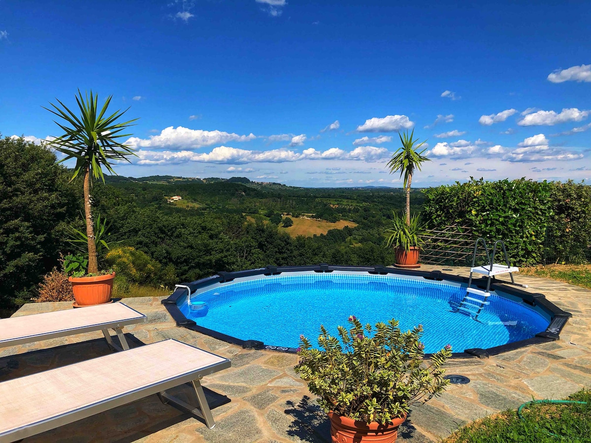 Apartment fully furnished and equipped with every comfort, located in the first floor of villa in the countryside, completely independent. The house has an independent entrace, two comfortable bedrooms, one bathroom with shower and a large living room with full kitchen. Large terrace with table and chairs where you can eat comfortably while enjoying a suggestive panoramic view of the surroundings. Outside a relaxing garden with swimming pool, games for children and fitness tools. Max 6 people.