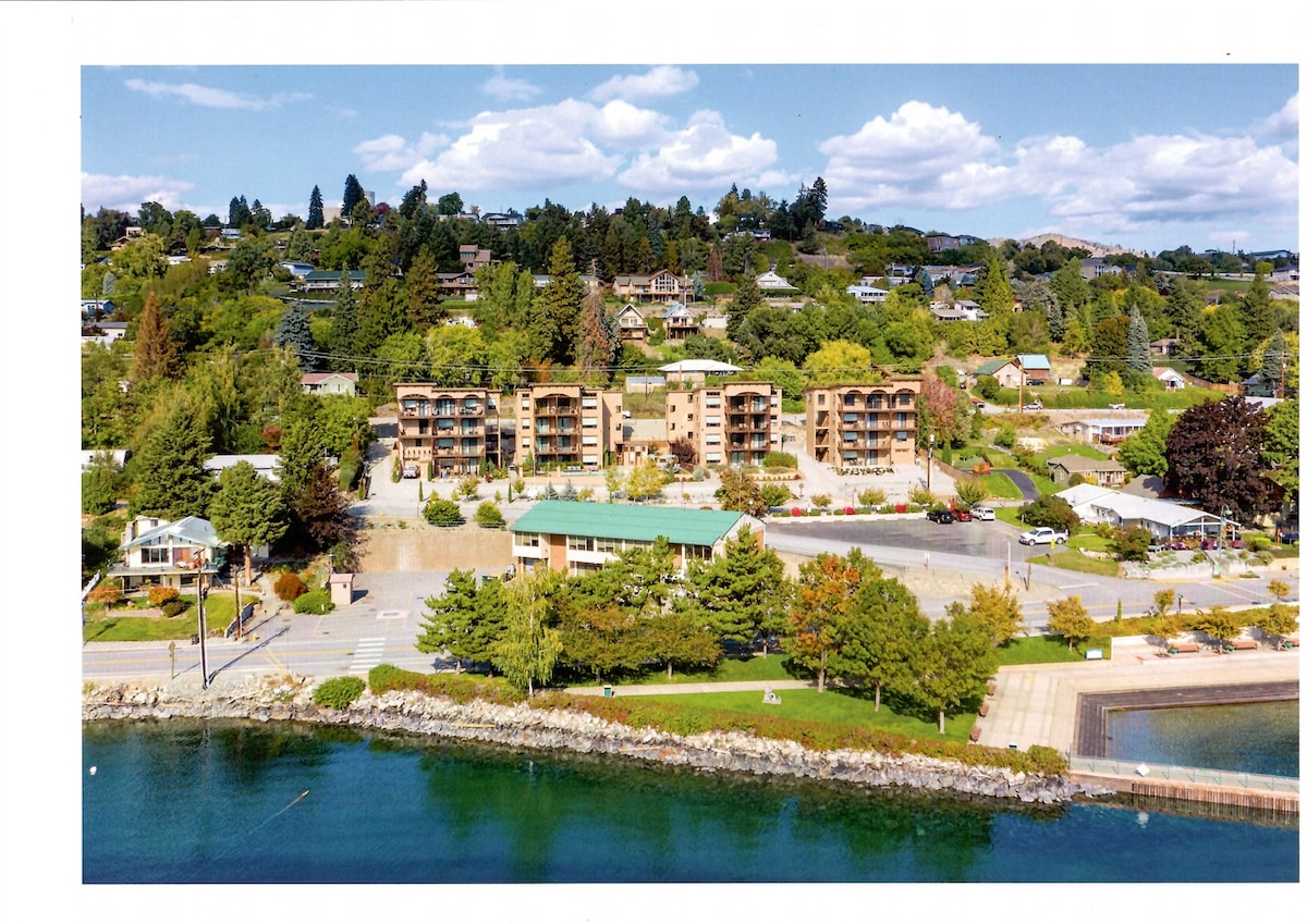 Just steps from Lake Chelan's shore, this ground floor STUDIO condo is perfect for couples and small families, it features a Queen size Murphy bed, twin pull-out, a full size sleeper sofa w/memory foam, full bath with powder room and a well-equipped kitchen. Enjoy the private beach, Olympic-sized pool, and nearby attractions with a 10 min walk to town or a 5 min drive to the water park. Pickle ball court and paddles! Pool closed October 1-May 15. Hot tub open year round seconds from the unit.