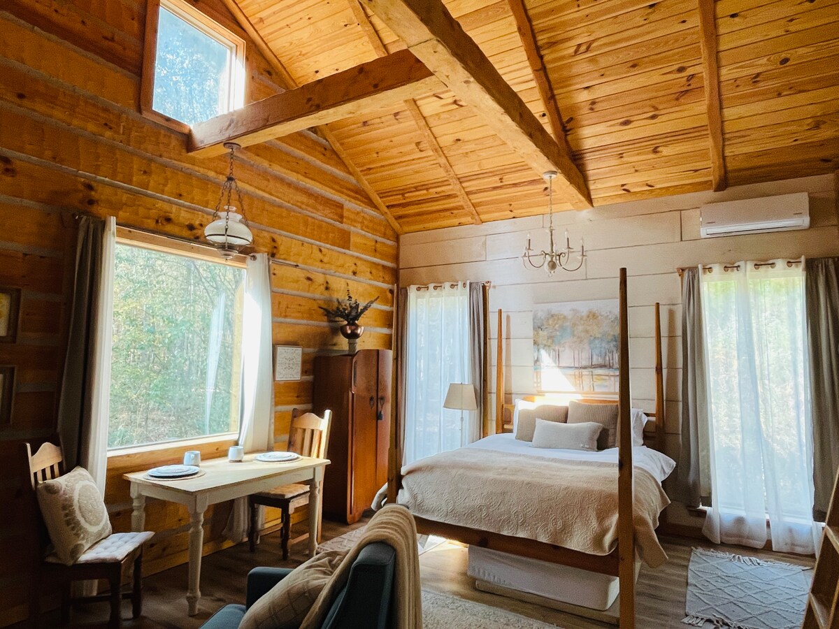 Can you say RESTFUL RETREAT?! Nestled on 20+ acres, the cabin is a beautiful place to rejuvenate. The open concept interior is all wood, many planks were hand-crafted for “old world” feel. Kitchenette, desk, loft, and porch. Just three-minute walk from gardens, infrared sauna, soaking tubs, and outdoor showers. A peaceful space to rest, refocus, and refuel. Guest say that our queen-size bed is the most comfortable ever! Conveniently located 1 mile from Interstate 20, 5-10 min town center.