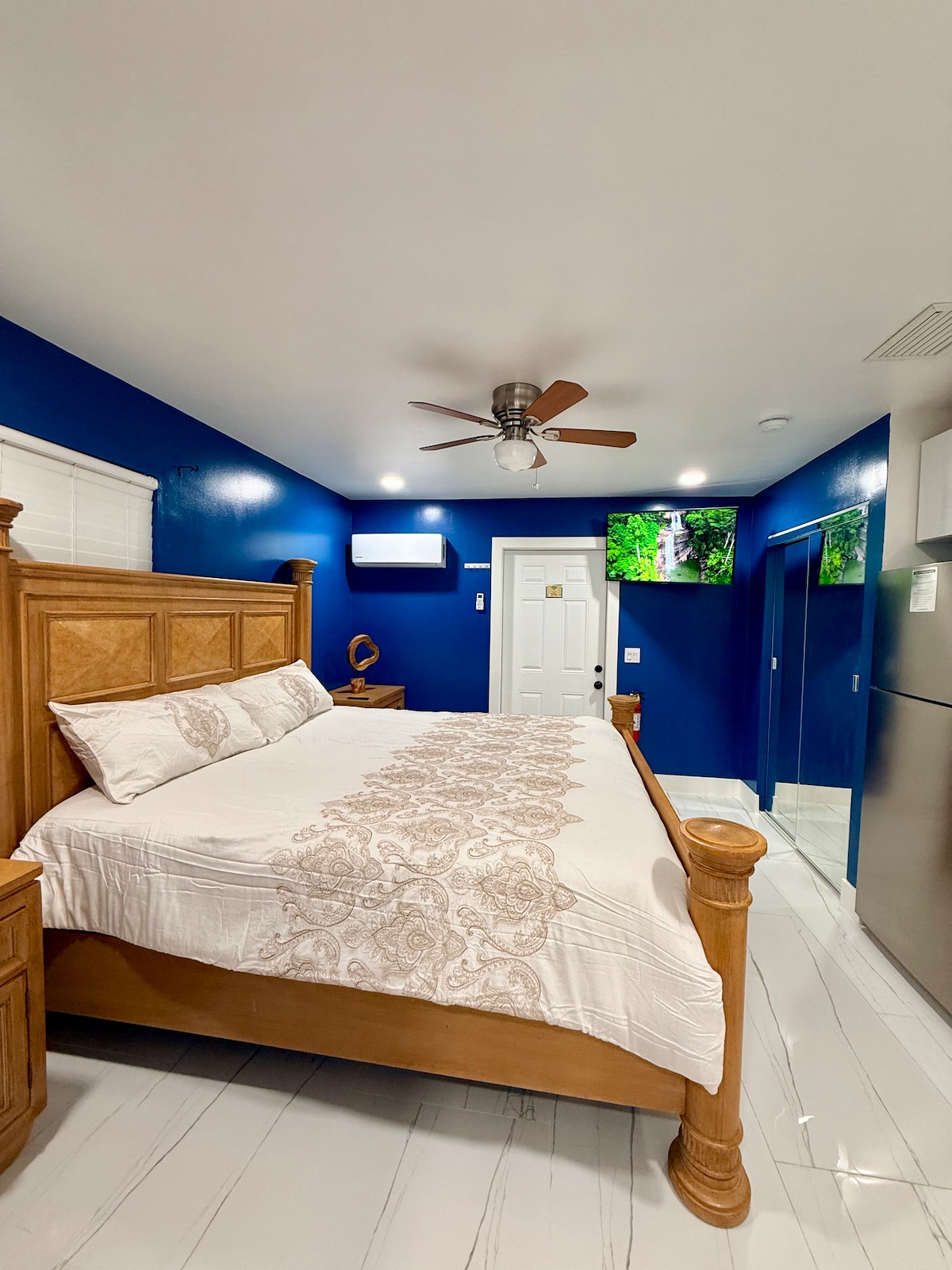 Welcome to this renovated studio apartment in WPB, FL. Attached to a single-family home, this cozy space offers a queen bed, closet, ceiling fan, and a 43" smart TV. The bathroom includes a walk-in shower and vanity. The kitchenette has a fridge, coffee maker, toaster, rice maker, air fryer, and induction stove. Enjoy meals at the dining table for two. Relax in the private patio with seating. Close to restaurants, shopping, parks, and the beach, with easy access to public transport. Book now!