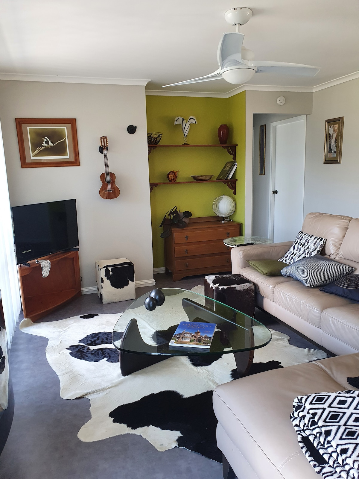 This stylish place situated with water views of St George’s Basin is perfect for couples or a small family. One large king sized bedroom; fitted wardrobes and water views. One double size bedroom with fitted robes and water views. A very large family bathroom. Full equipped chefs kitchen. Huge entertainment balcony with BBQ, large table/chairs,sun loungers. White string lights strung across the ceiling make for a magical alfresco experience