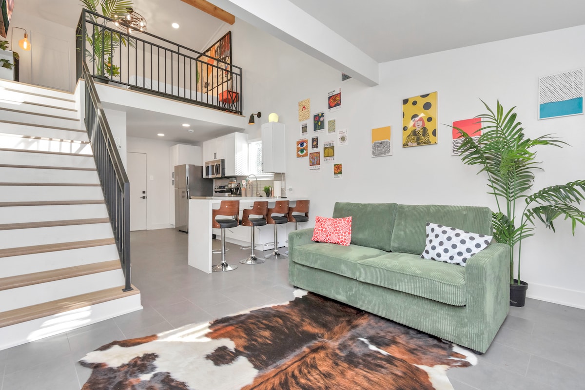 On a private 14-acre countryside retreat, this tiny home provides an unforgettable lodging experience. Our innovative Cargo home is outfitted with premier amenities including a 14” queen mattress with luxury linens, Smart TV, private front porch area, convenient parking, free WIFI, fully stocked kitchenette, Keurig coffee maker, and so much more! The best part of this unit is our rooftop deck where you can enjoy a romantic dinner, stargazing, or sip on a morning cup of coffee.
