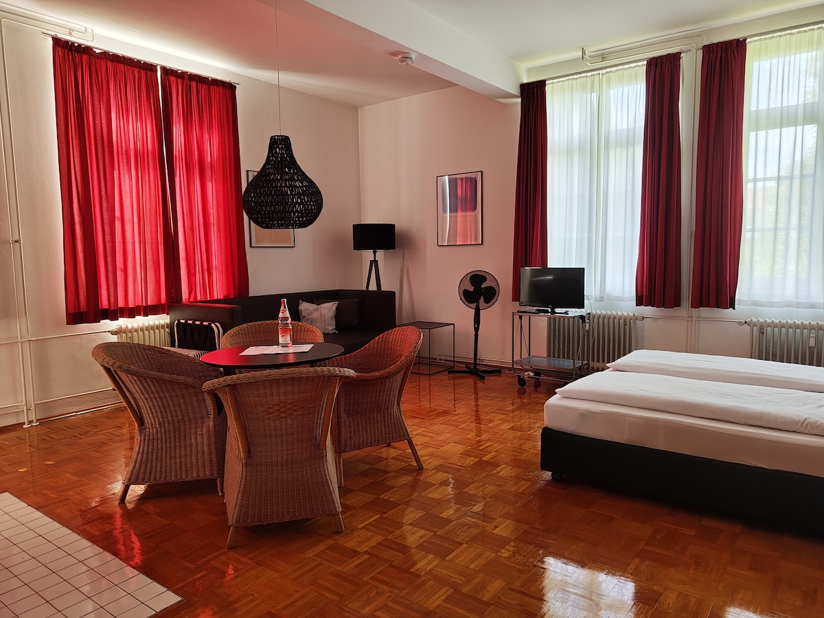 Willkommen in unserem charmanten Studio-Apartment, ideal für Paare oder Freunde. Das Apartment befindet sich in einem ehemaligen Hotel und bietet ein bequemes Bett, ein grosses Schlafsofa und einen Esstisch. Die Küchenzeile ist mit Kühlschrank und Kochplatten ausgestattet. Das Bad verfügt über WC und Badewanne/Dusche. Ein privater Parkplatz steht zur Verfügung. Die Lage ist ausgezeichnet: Nur 10 Minuten zu Fuß zum Rhein und 20 Minuten bis zur Stadtmitte. Wir freuen uns über euren Besuch.