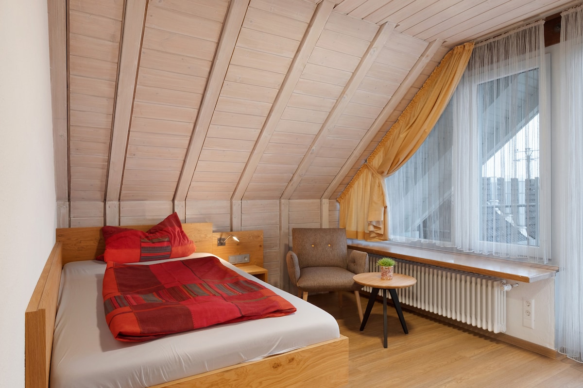 The Double Room Bavaria in Meersburg offers you 17 m² of space for up to 2 guests. During your stay, you have a bedroom and a bathroom at your disposal. The room is equipped with private Wi-Fi and a TV, so you are well taken care of during your stay. Enjoy the comfortable furnishings and the pleasant atmosphere of the room. We look forward to your visit! Our house is located about 30 meters from the lake and about 50 meters from the boat docks, right in the historic town center.