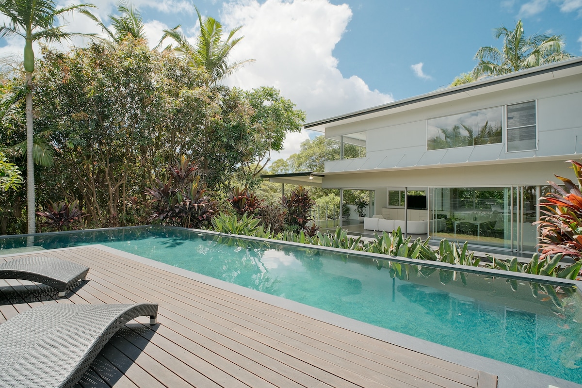 *Featured in Australian House and Garden and green magazine, this architecturally unique holiday home in located on Caloundra’s beautiful headland. It features a magnesium pool, bocce court, 2 fireplaces, plus amazing outdoor bath & showers. The separate living and sleeping pavilions are connected by courtyards with lush gardens, creating a relaxed coastal vibe that is an escape from the everyday. +Pets are welcome on request. *Special family rates are available. Message us to inquire.