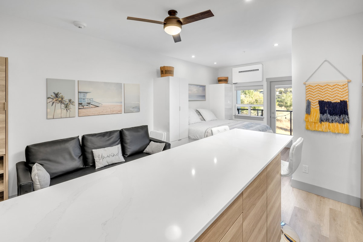 The Patio Suite is modern open-space design studio apartment, offering perfect blend of quite peaceful and complete privacy with nature, beaches , and all city amenities within minutes walk. Your own private entrance and private shaded patio ready for outdoor dining , full kitchen, spacious en-suite, queen size bed & memory foam mattress , stereo , 40" smart tv , & fast internet. All on ground level and full wheelchair access. Parking is on property , with EV charging outlet .