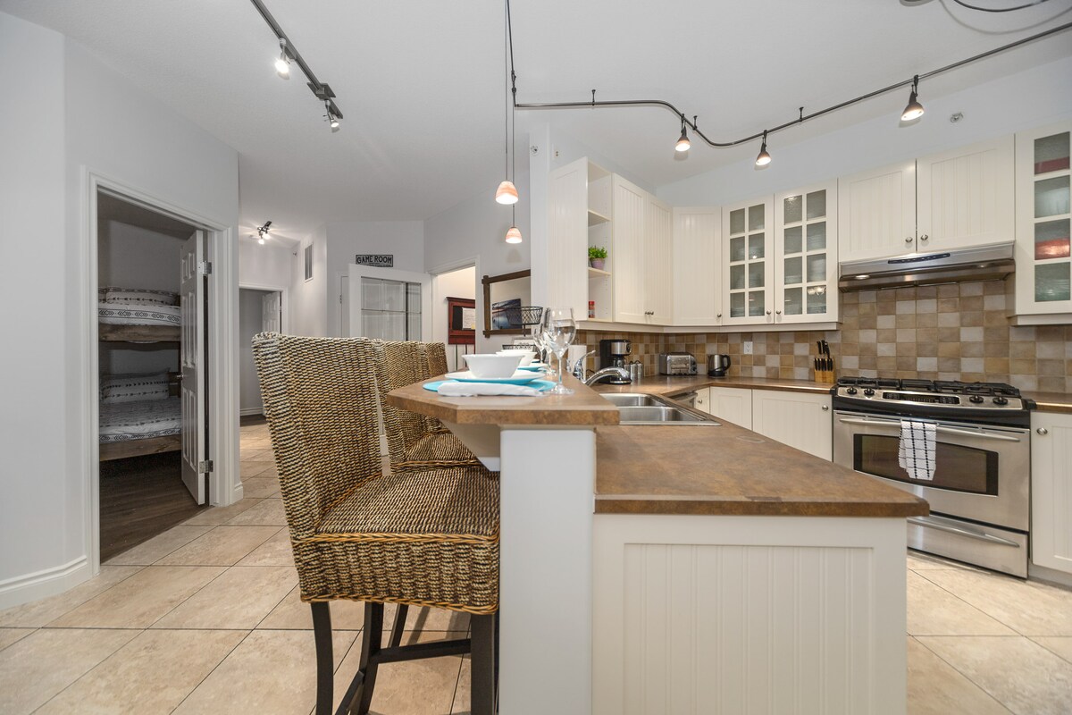NO Cleaning Fee! Enjoy this bright 2-bed/2-bath condo in the heart of Kelowna. Sleeps 6 with a king, queen, and queen sofa-bed. Cook in a full kitchen, relax by the gas fireplace, stream Netflix on the large TV, or sip morning coffee on the balcony. A very walkable neighbourhood with nearby parks, beaches, wineries, breweries, shops, and restaurants. Free self check-in, secure parking, in-suite laundry, central heat/air, and high-speed WiFi. 2 pools with hot tubs, one open year round!