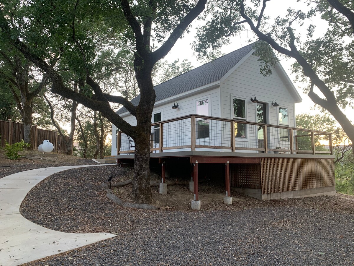 Beautiful new cottage with lots of light, swing, and gas fireplace. Large open space with private deck looking out at Mt St. Helena. In the evening, turn on the outdoor string lights and relax on the swing under the huge oak tree before sinking into the memory foam king size bed. In the morning there is pour over coffee and robes so you can sit outside and sip your coffee. Perfect place to stay for a while, or have a romantic weekend.