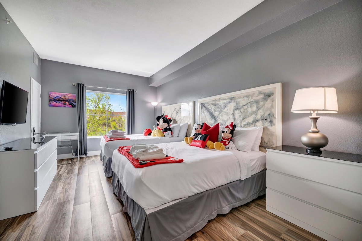 2B/2B Disney Resort Condo at Floridays just 10 minutes to Disney Theme Parks and 10 minutes to Universal Studios! Orlando Outlets just 4 minutes & plenty of restaurants and bars all a short drive/uber. At our condo, you SAVE a lot of money! NO resort fees, FREE parking, FREE breakfast (see options), FREE wifi, and so much more! Enjoy 2 HEATED POOLS, 2 HOT TUBS, a full arcade, a full gym, on-site convenience center, and a bar & grill. We're FAMILY FRIENDLY! Our condo comes with a travel stroller!