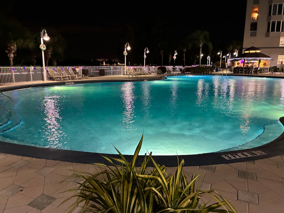 Welcome to this luxury waterfront condo in the sky overlooking Lake Bryan and Disney Parks at an impressive 210 ft above ground level. Enjoy spectacular sunrises from our private balcony or catch the nightly fireworks show on the front veranda. Universal Studios, Sea-World, Legoland, great shops at Disney Springs, and endless restaurants are all so close! Full resort access with no hidden fees. Free parking space, pool, hot tub, gym, arcade, nature preserve boardwalk, jetted bath tub, & more!