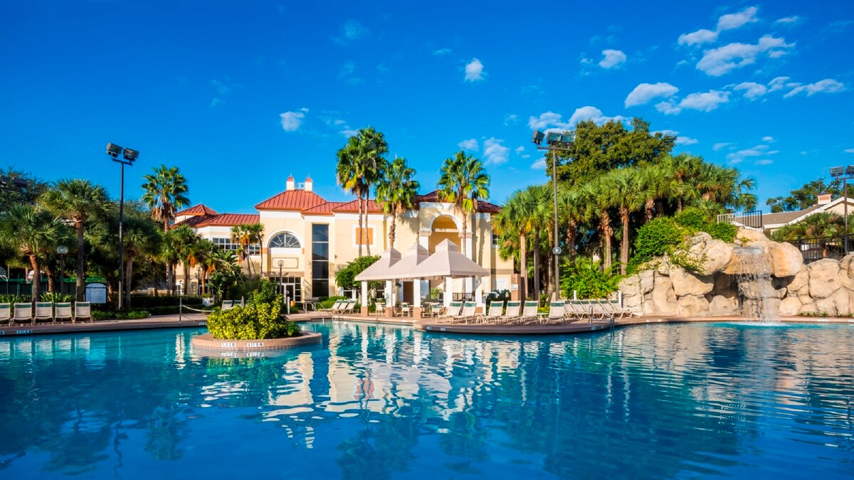 Two Bedroom Deluxe Suite. Five outdoor pools and 9 outdoor hot tubs with a Lazy River and a Fort and Pirate Ship great for the kids. Scheduled transportation to Disney World and Epcot Center. Private cabanas available for rent with TV and a stocked fridge. Three fitness centers and four game rooms. Restaurants and Deli on-site. Universal Studios and the Wizarding World of Harry Potter, SeaWorld, and Shrek within a short drive.