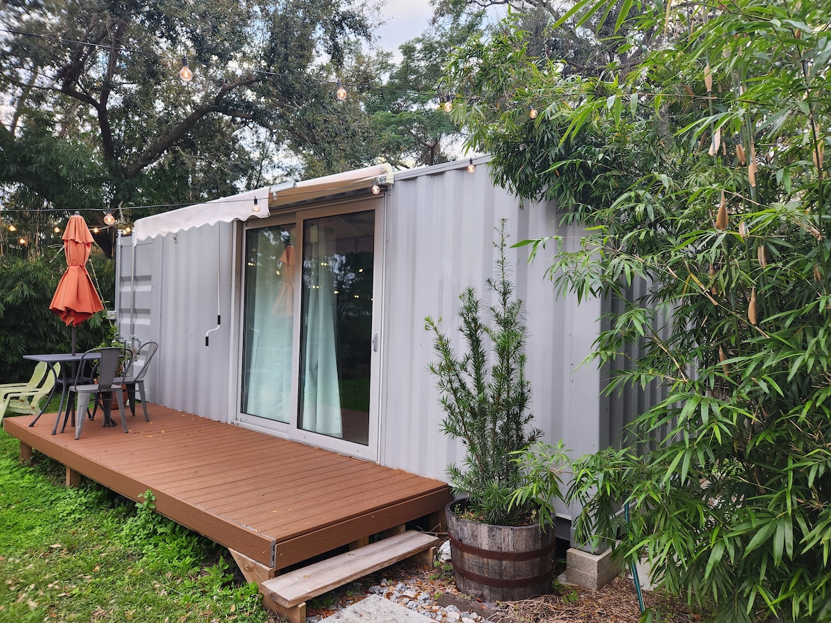 This is a unique stay in a container that has been transformed into a studio. Similar to a tiny home but without climbing into a loft. The Container is outfitted with a Kitchen, Bath and sleeping area. Cozy and quaint is the best way to describe it. The location is in my backyard in College park, near major roadways for easy travel to the theme parks, Winter Park restaurants and Downtown entertainment.