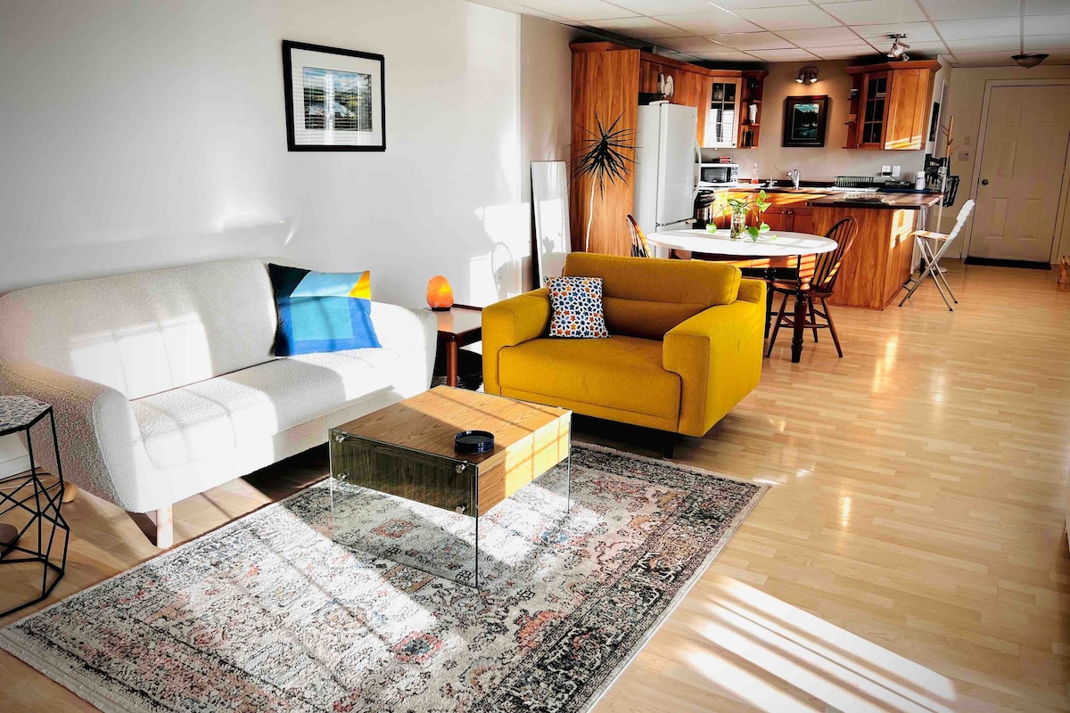 Welcome to our cozy, one-bedroom private 1000+sq ft suite. Perfect for work or long stays: living and dining areas, desks, reliable Fast WiFi 348Mbps, 55” Smart TV, gas fireplace, sofa bed, 2nd sofa, covered deck, private fenced yard with partial ocean view. Spacious bedroom with one queen and a twin bed, full bathroom/shower. Free parking, in-suite washer/dryer, 2 e-bicycles for use. Pet friendly: small to medium-sized well-behaved dogs preferred. Prov#H152939652 Muni licence #0010785