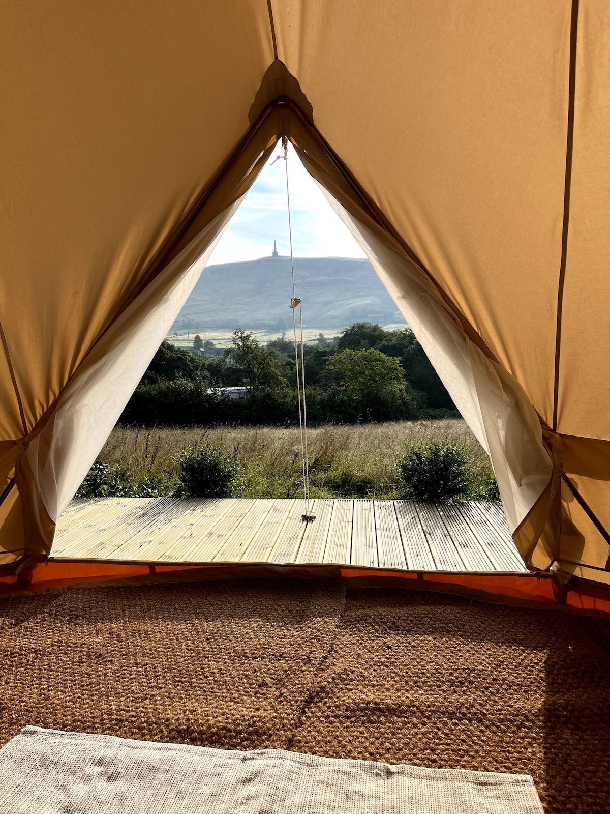 Cross Farm invites you to Retreat, Restore & Revive. Our Bell tent is set in a wild 1 acre field with stunning views of The Stoodley Pike. Wake up to the sunrise over the hills, rustling of the trees, birdsong & chatter of the sheep in nearby fields. Our Bell tent comes with a king size bed, stove, kettle, fridge, sofa, bed linen, towels & slippers, outdoor seating area, shared toilet, private shower with eco shower products & fully equipped kitchen in our barn. All you need for a relaxing stay