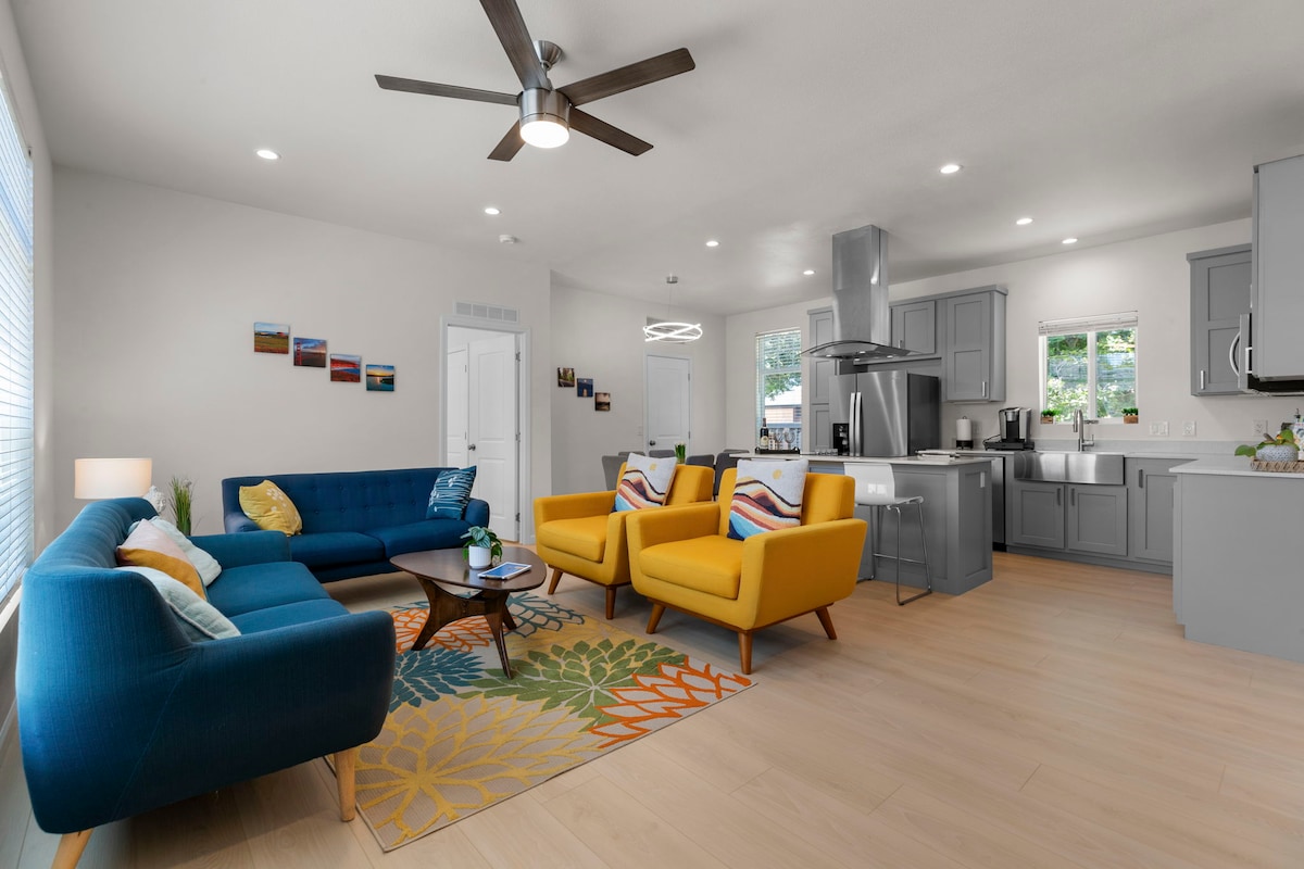 Enjoy a stylish experience at this centrally-located brand new home. Mission Peak view from the living room and kitchen. Fremont Bart, Kaiser & Washington hospitals, Central Park, Vargas Plateau hikes, Trader Joes, Wholefoods, charming historic Niles district are all within a 2-mile radius. The home is furnished with a mid-century modern vibe that colorful and classy. The 9 foot high ceilings give it an airy and spacious feel. Free parking for 1 car on the property and free street parking.