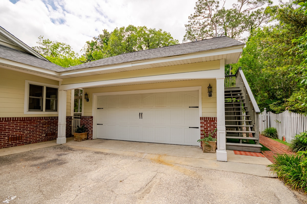 Welcome to your peaceful getaway, central to everything in Tallahassee! King bed ✔ Spacious, mural wall patio with a fenced back yard ✔ Private Parking ✔ Dogs Welcome ✔ Well-stocked kitchenette ✔ Mid-century charm ✔ Coffee, tea, snacks ✔ Cozy up with a movie in front of the custom wood slat wall, cook dinner in the kitchenette, and get a quiet night's rest under a stylish wood ceiling. You are: - 5 mins from TMH - 8 mins to downtown - 8 mins to FSU - 7 mins from I-10