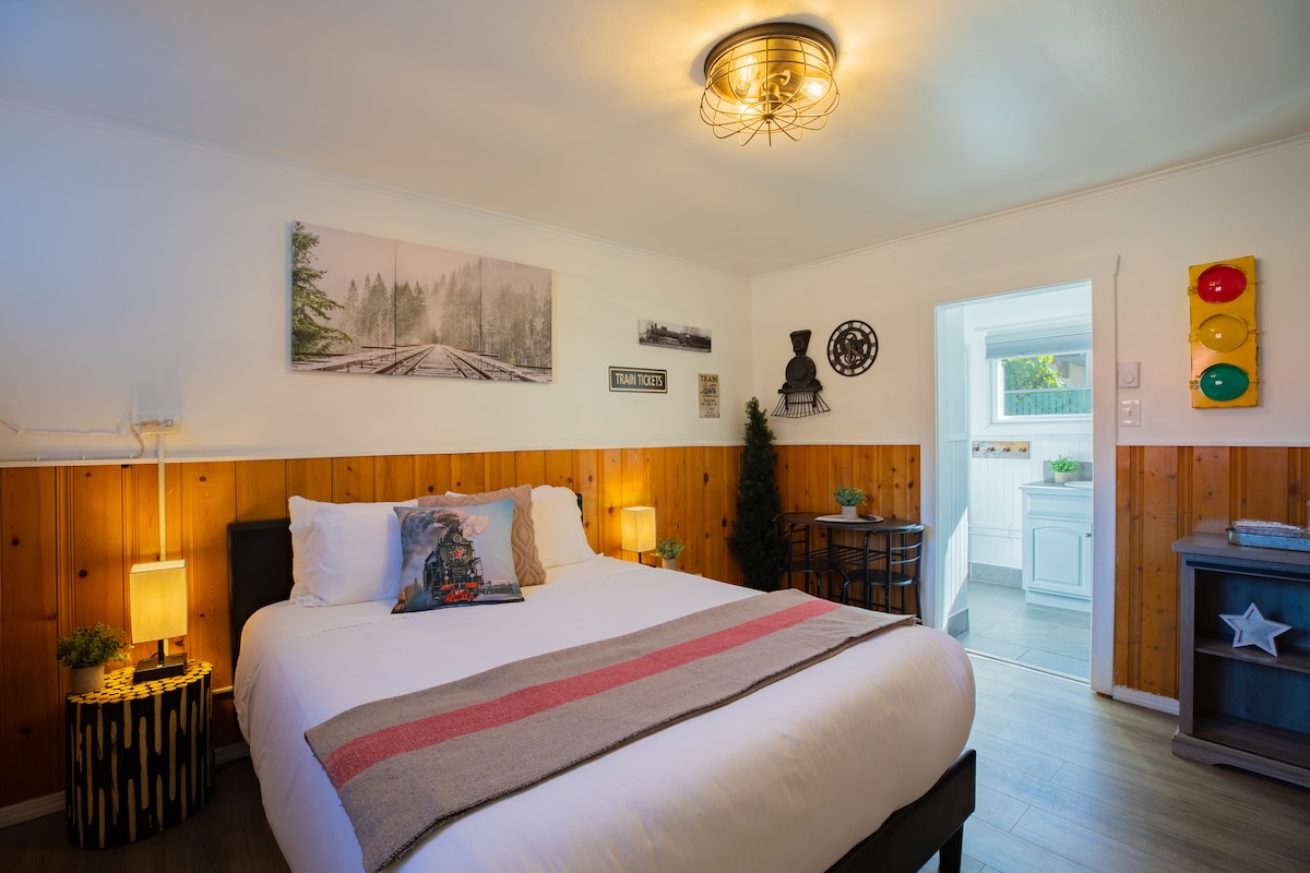 Welcome to the historic Lake Chelan Manor! This beautifully remodeled private room features a queen bed and ensuite bath. Walk to the lake, downtown, Riverwalk Park, and Pingrey Park. This is a private guest room in a shared building—like a boutique inn—so you may see other guests in shared areas. Coffee bar, mini-fridge, and TV included for your convenience. Max 2 guests. Ideal for couples or solo travelers seeking comfort and convenience in the heart of Chelan.
