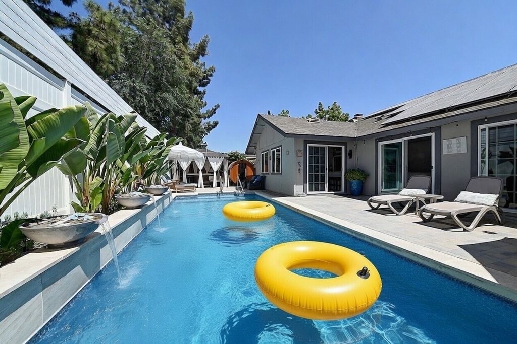 Welcome to Chuchu’s Luxury Retreat! This entire home is surrounded by beautiful water views: a stunning private pool with waterfall, rejuvenating sauna, hot SPA jacuzzi, peaceful koi pond, flowing rock river, and lovely water fountains in the backyard , we also have big games room . Just a 5-minute drive to Irvine Spectrum shopping center , and only 7 miles to get breathtaking Laguna Beach. The home features 3 bedrooms, each with direct access to the pool area. Enjoying your perfect getaway! 😊