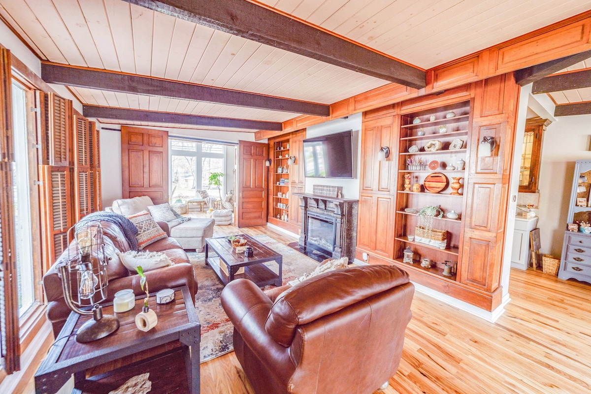 Cozy, quiet, accessible Lake Geneva home with large open living area, vaulted ceilings, large 1-acre wooded lot. 3 minutes from beach, 5 minutes to both Lake Geneva and Williams Bay, 2 minutes to a local Wisconsin-style convenience store. Welcome to the Peacock Cottage! Located on a deep, private lot surrounded by woods, so it's great to let loose without any nearby traffic. We are super into cozy homes, and love creating spaces that are restful and fun.