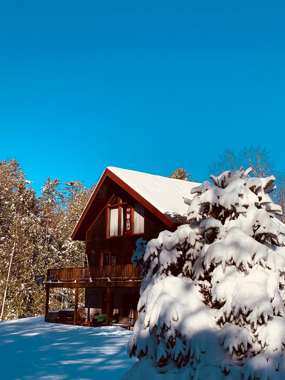 This large open floor plan chalet is situated on a sprawling secluded property bordered by two babbling brooks and miles of beautiful wooded trails. Enjoy your morning coffee on the wraparound deck or relax in the evening around the fire pit. Special features include electric fireplace, outdoor fire pit, bar, pool table, theatre room, loft with twin bed, 4 private bedrooms, 2 full baths. Guests must have ability to navigate stairs.