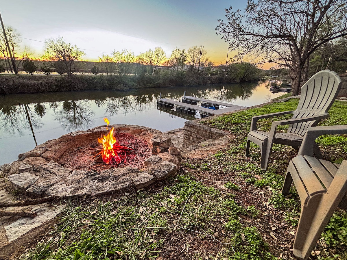 Take it easy at this unique and tranquil getaway. A lakefront oasis, with the Brazos River across the street. Go fishing in the lake from the backyard dock, or launch a boat into the river at the boat ramp up the street. Roast marshmallows around the fire pit, cook burgers on the gas/charcoal grill, and dine on your outdoor dinner table. Later, enjoy a glass of wine at sunset on the covered deck or on the shaded rockers by the dock. Located just 9.5 miles from the beautiful Granbury town square.
