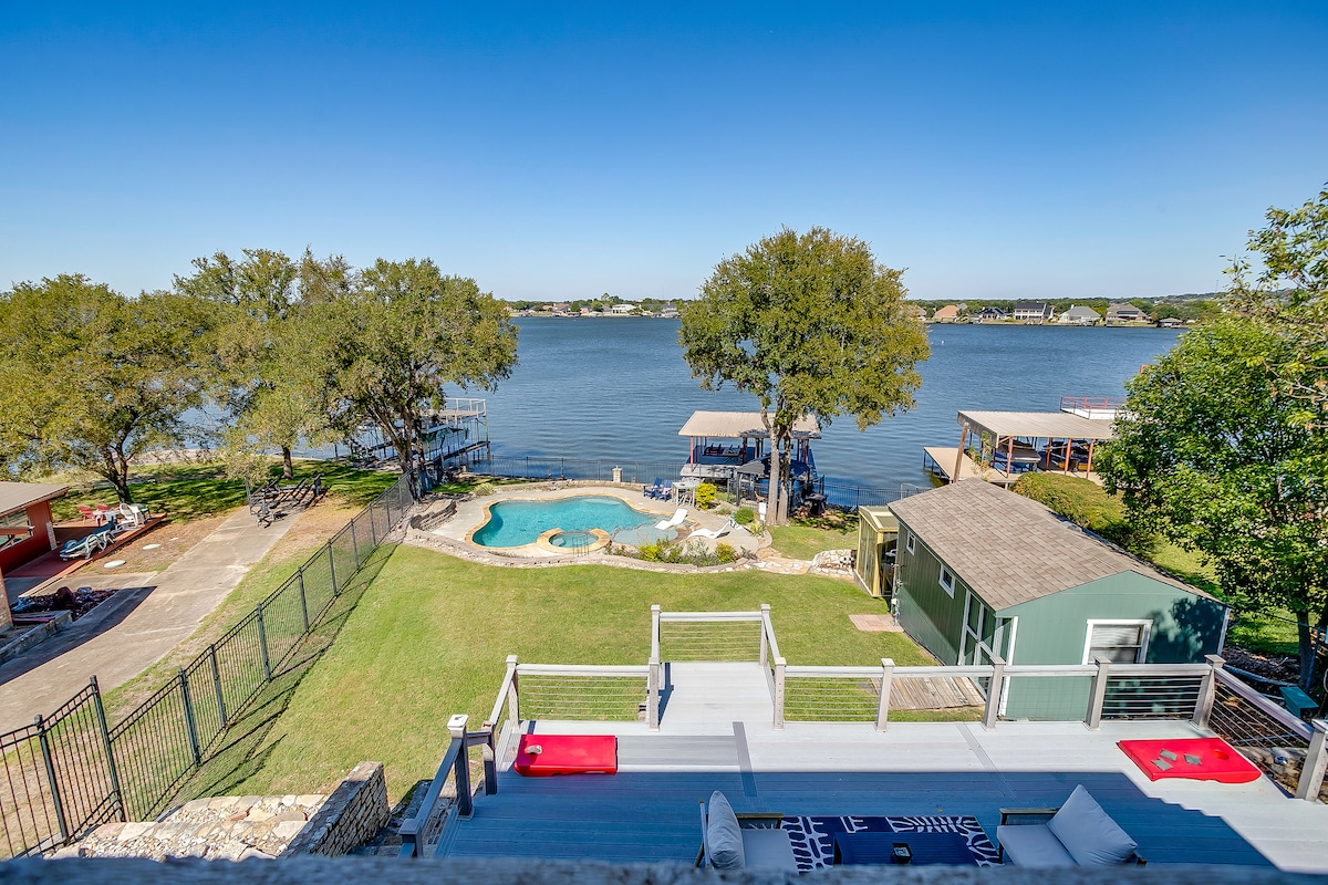 Come enjoy stunning views! This private home sits on almost an acre of waterfront property and includes a private dock, pool, hot tub, and outdoor kitchen. Inside, enjoy relaxation at its finest including game room, entertainment room with seating for 20+. Smart TV's in every living area and bedroom. All this within 3 miles of the famous Granbury Square. Also have adjoining tiny home available to rent and add 4 additional guests https://www.airbnb.com/l/rD4kTJAO