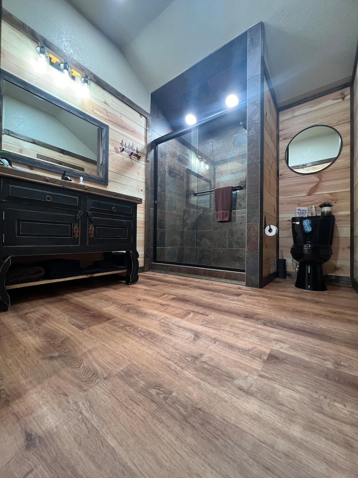This Lodge Style Cabin is the Perfect Place to Enjoy a Few Days in Hot Springs! From the Pine Clad Walls, to the Covered Back Deck overlooking the Property, you will Decompress the Moment you Walk through the Front Door... this Rustic Modern Retreat features a Sitting Area, Kitchenette, King Size Bed with Comfy Linens and an EnSuite with a Custom Walk-in Shower! You will Love Sitting on the Back Porch with your Morning Coffee and Planning your Adventure for the Day!