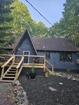 Come and relax at Vista View- a unique, 1970 contemporary cabin in the heart of Lake Harmony! The raised home and large wrap around deck will feel like you're staying in a treehouse. Enjoy the private hot tub with woodland views, the outdoor firepit, access to Lake Harmony & LH Beach, and much more! Central to the Poconos, Lake Harmony seated between Boulder View and Jack Frost Mountain with "Restaurant Row" & Split Rock Water Park right around the corner. HIGH SPEED INTERNET & Netflix provided